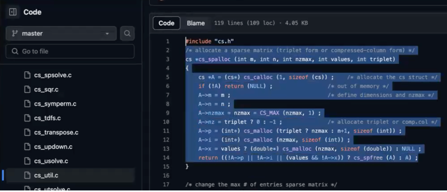Figure 4. For this example, the code snippet, provided by GitHub Copilot, is a direct match to the cs_spalloc function of cs_util.c in this project.