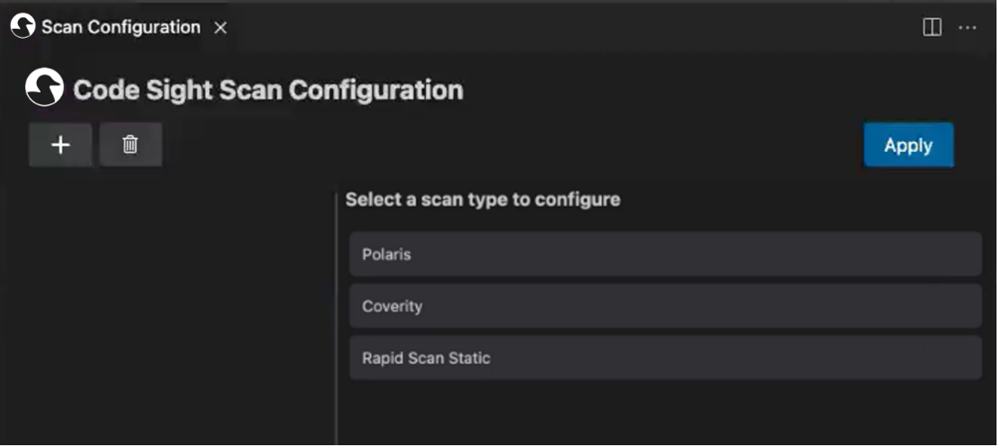 You can also add or delete scan configurations without leaving the IDE. Start by adding or modifying a scan type, which will automatically display configuration options based on the scan engines selected in the Local View pane within the IDE. Available options depend on whether you organization use Polaris, Coverity® Static Analysis, Black Duck® SCA, or Rapid Scan with Code Sight.