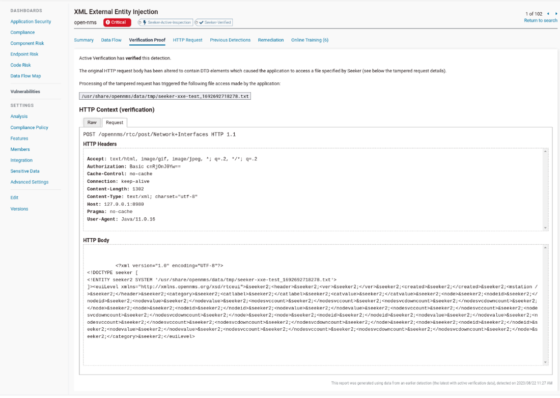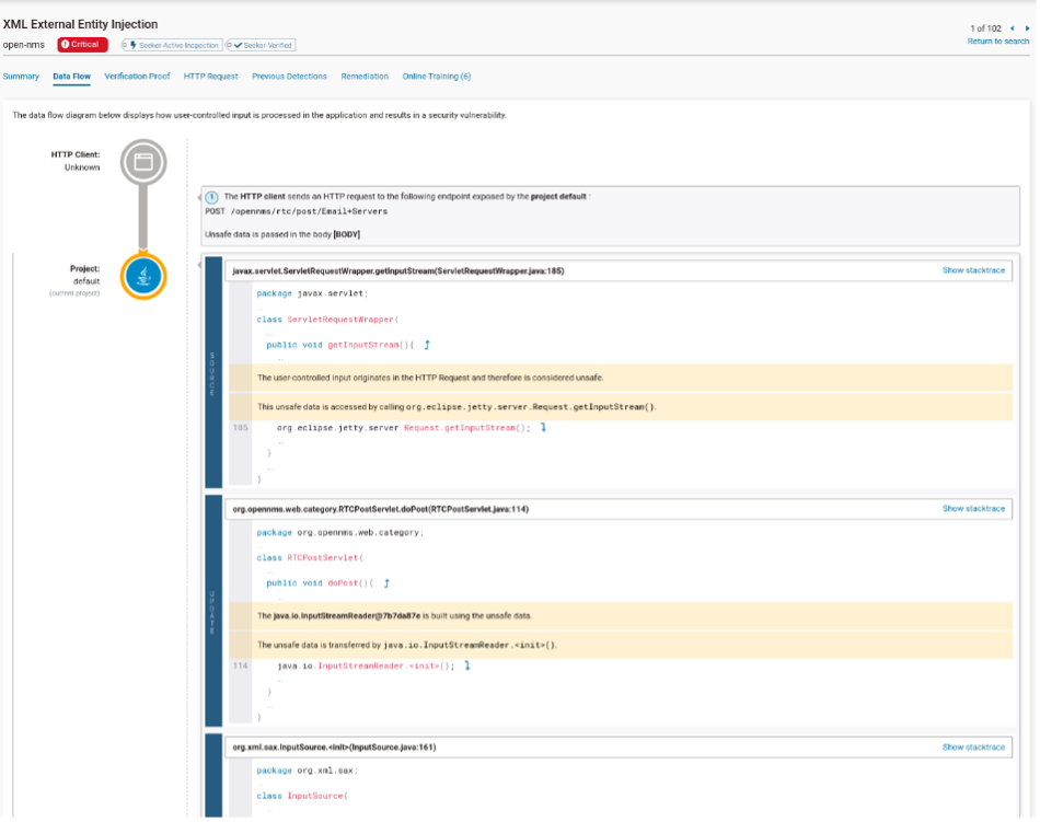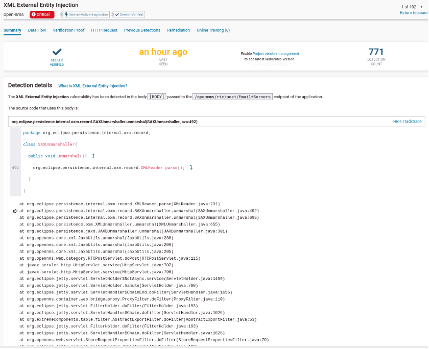 Seeker identified that the XML parser that unmarshals tainted data was misconfigured. It also sent additional requests to exploit the XXE, and they succeeded, so the finding is tagged as verified. Here is a summary of the XXE along with full stack trace of the XML sink.