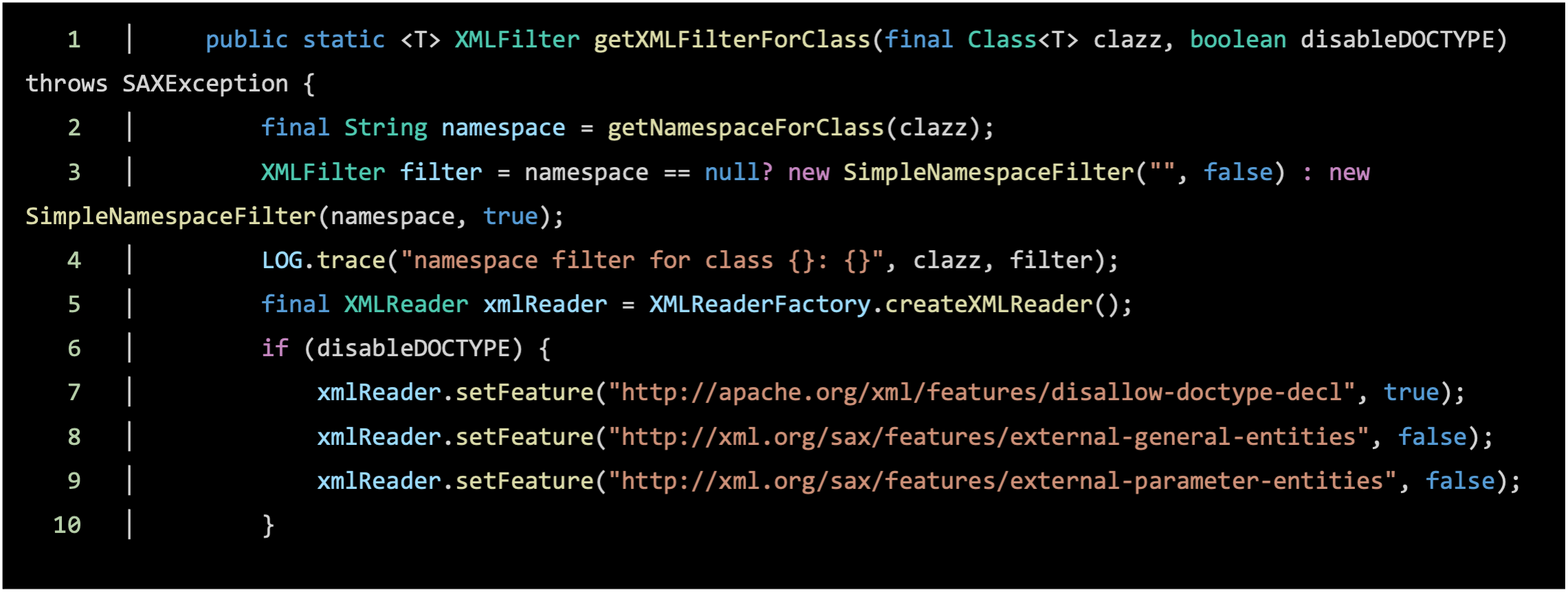 The getXMLFilterForClass function is eventually invoked by JaxbUtils.unmarshal, and the disableDOCTYPE parameter value is false. As a result lines 7 through 9 are skipped, which means the XML parser will use a configuration that is vulnerable to XXE injection, that is, the parser will
