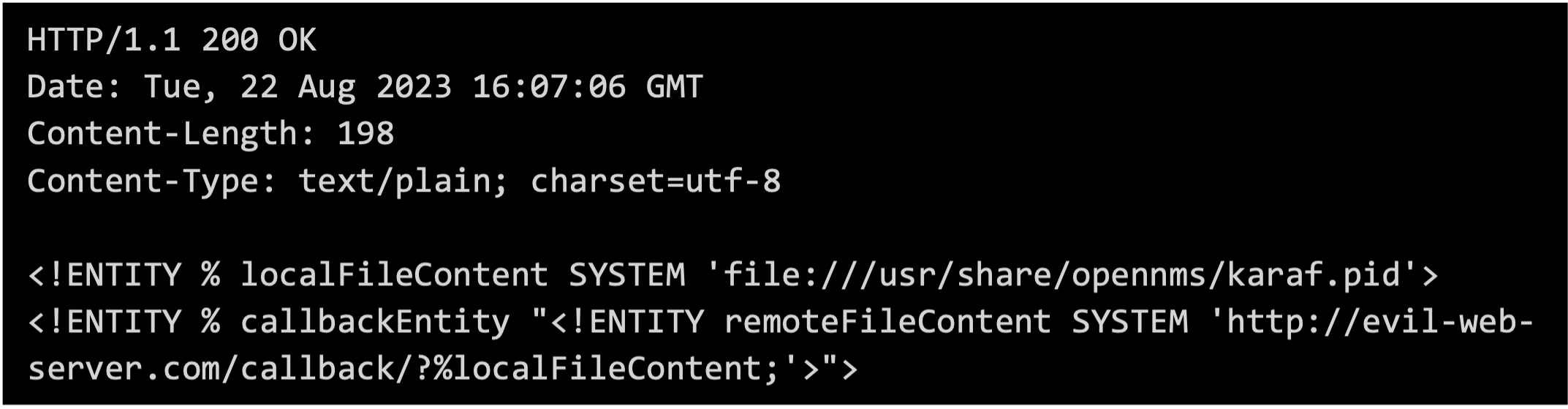 The evil web server responds with the content of the ‘external_document_type_definition.dtd’ file (from evil web server to OpenNMS instance).