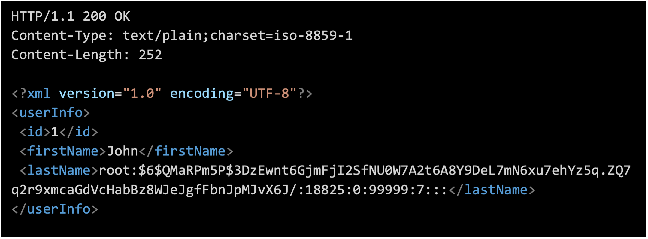· <lastName>&ent;</lastName>: This is an XML element called "lastName" where the content is being replaced with the value of the "ent" entity. Since "ent" is defined to reference the contents of the /etc/shadow file, this is an attempt to include the file content within the XML.