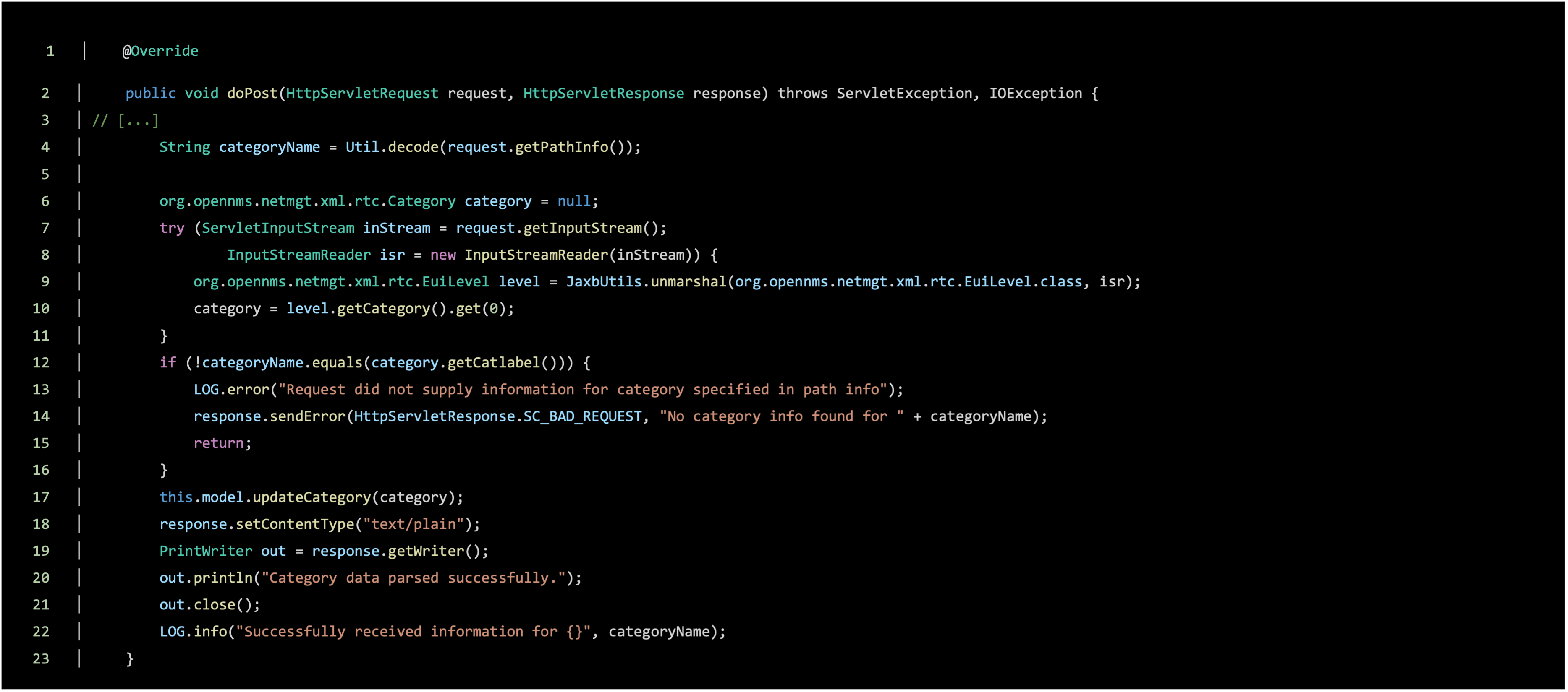The XML unmarshal sink is (indirectly) invoked by line 9, JaxbUtils.unmarshal, which unmarshals the XML from the HTTP request body into a org.OpenNMS.netmgt.xml.rtc.EuiLevel instance. At first glance this code does not seem to be vulnerable to XXE since the HTTP response does not contain any data from the XML. However, the XML parser configuration are too permissive.