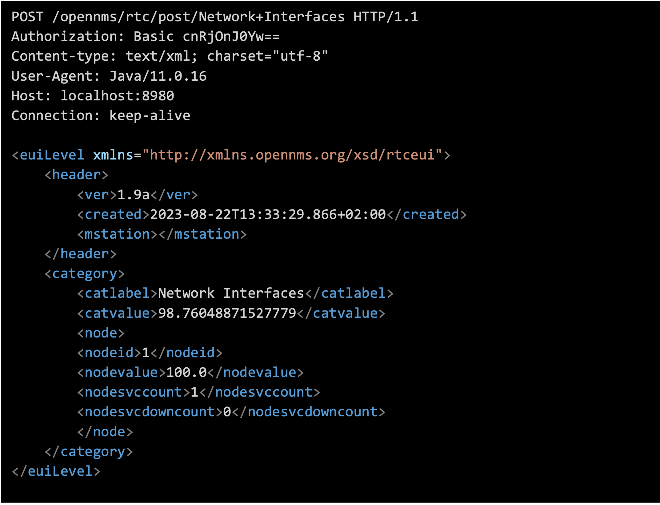 An initial HTTP request to /rtc/post endpoint (from an attacker to an OpenNMS instance) is this.